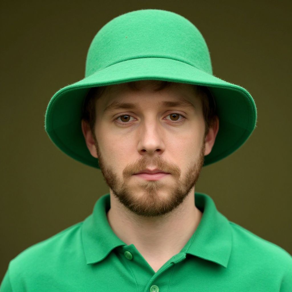 Photograph of a fair-skinned man with a trimmed brown beard and neutral expression, centered in the frame. He wears a bright green, wide-brimmed hat and a matching green polo shirt. The background is a solid, dark olive green, which contrasts with his lighter skin and green attire. The lighting is even, highlighting his facial features and the texture of the hat. The image has a slight digital enhancement effect, giving it a slightly surreal, vivid quality.