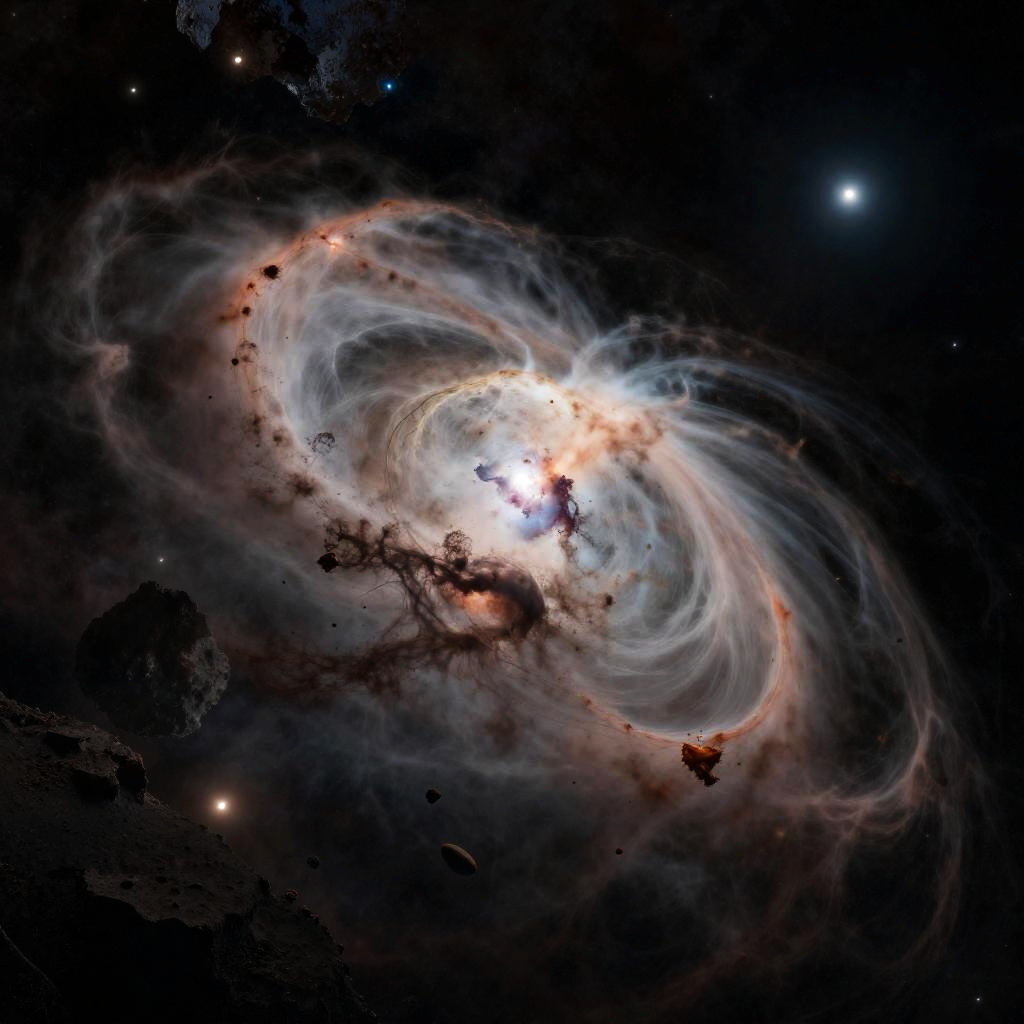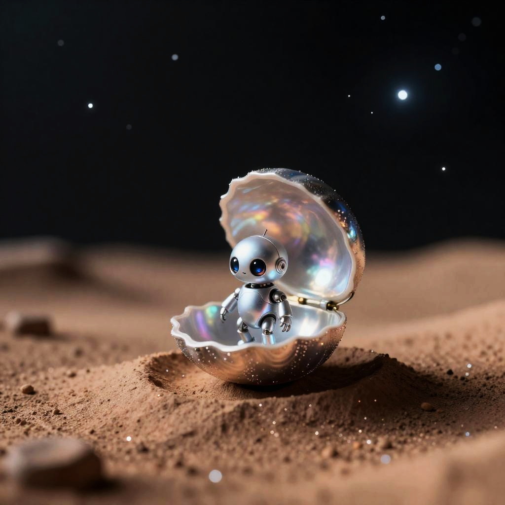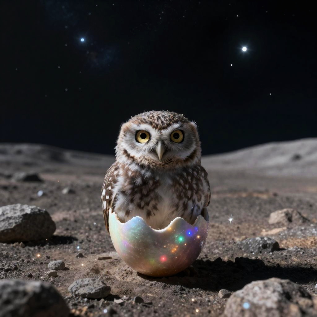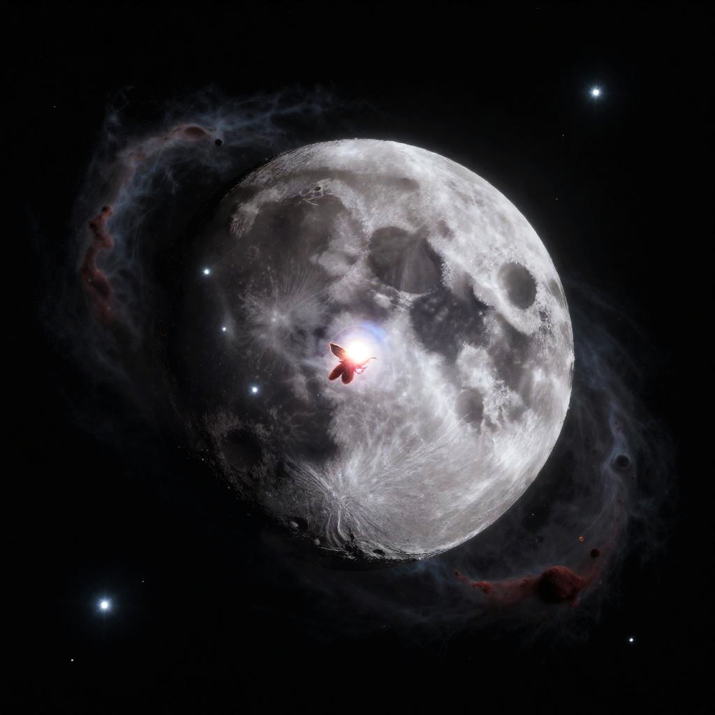 A micro mech hatching from a radiant energy core on the icy lunar plateau, surrounded by floating cosmic debris and radiant nebulas in the vast expanse of space.