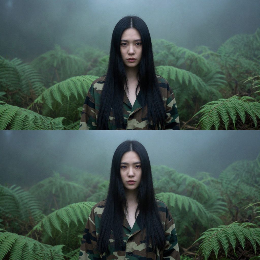 A female model with long black hair, emerging from a dense misty forest of fern leaves wearing camouflage by yohji yamamoto, in the style of daido moriyama, double exposure