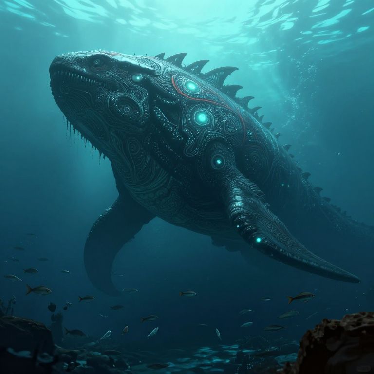 Subnautica leviathan concept art illustrating a colossal underwater beast with intricate organic patterns and glowing markings, rising from the abyssal plains, surrounded by schools of strange fish, moody lighting enhancing the creature's scale and power