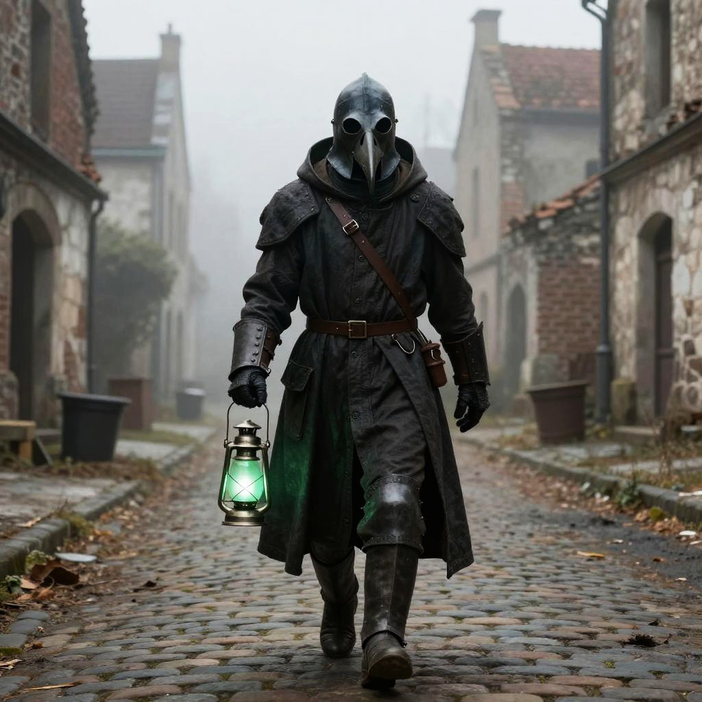 Plague doctor knight walking alone through a deserted ruined village, wearing layered protective garb with a beak mask, carrying a lantern emitting pale green light, fog swirling around cobblestone streets, cinematic and detailed.