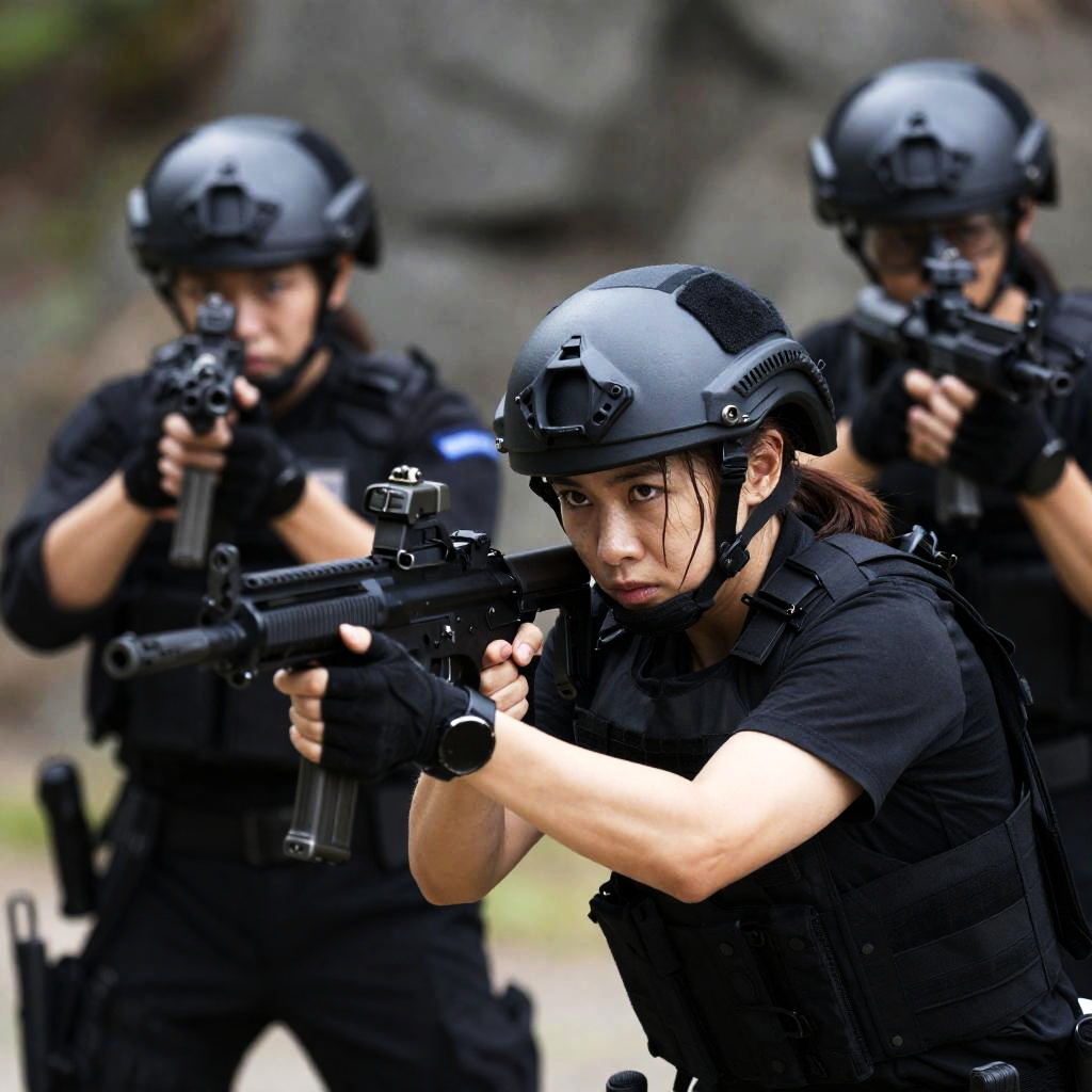 Photograph of three female SWAT team members in black tactical gear and helmets. Foreground woman with wet brown hair extends arm forward, intense expression. Two background women aim rifles, focused expressions. Rocky, forested background. Action-oriented scene.