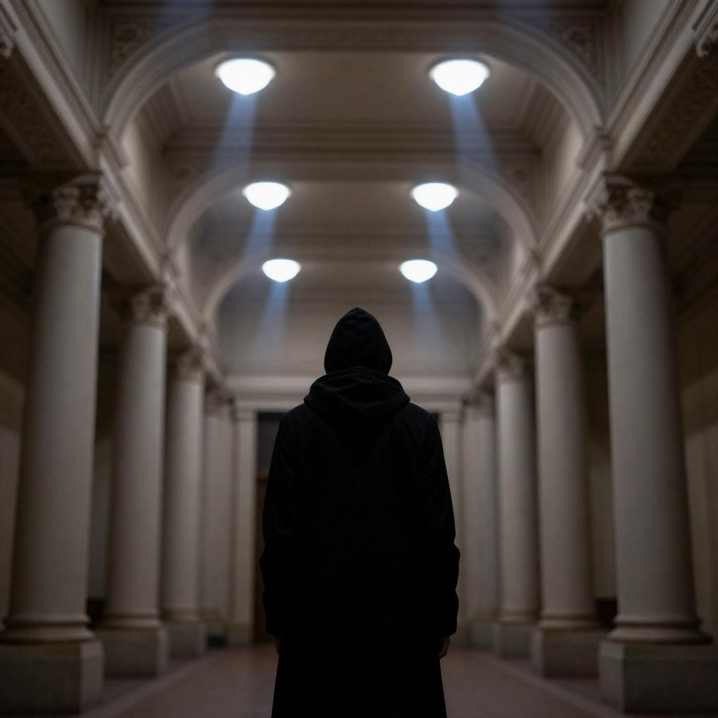 Silhouetted figure in hooded cloak stands in dark, grand hallway with ornate ceiling. Blue lights from ceiling beams illuminate the corridor. Multiple beams of light converge on figure. Columns line both sides of the hallway.