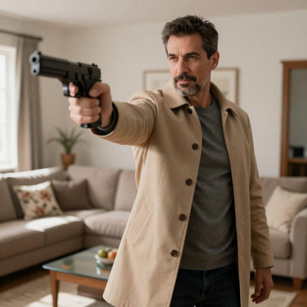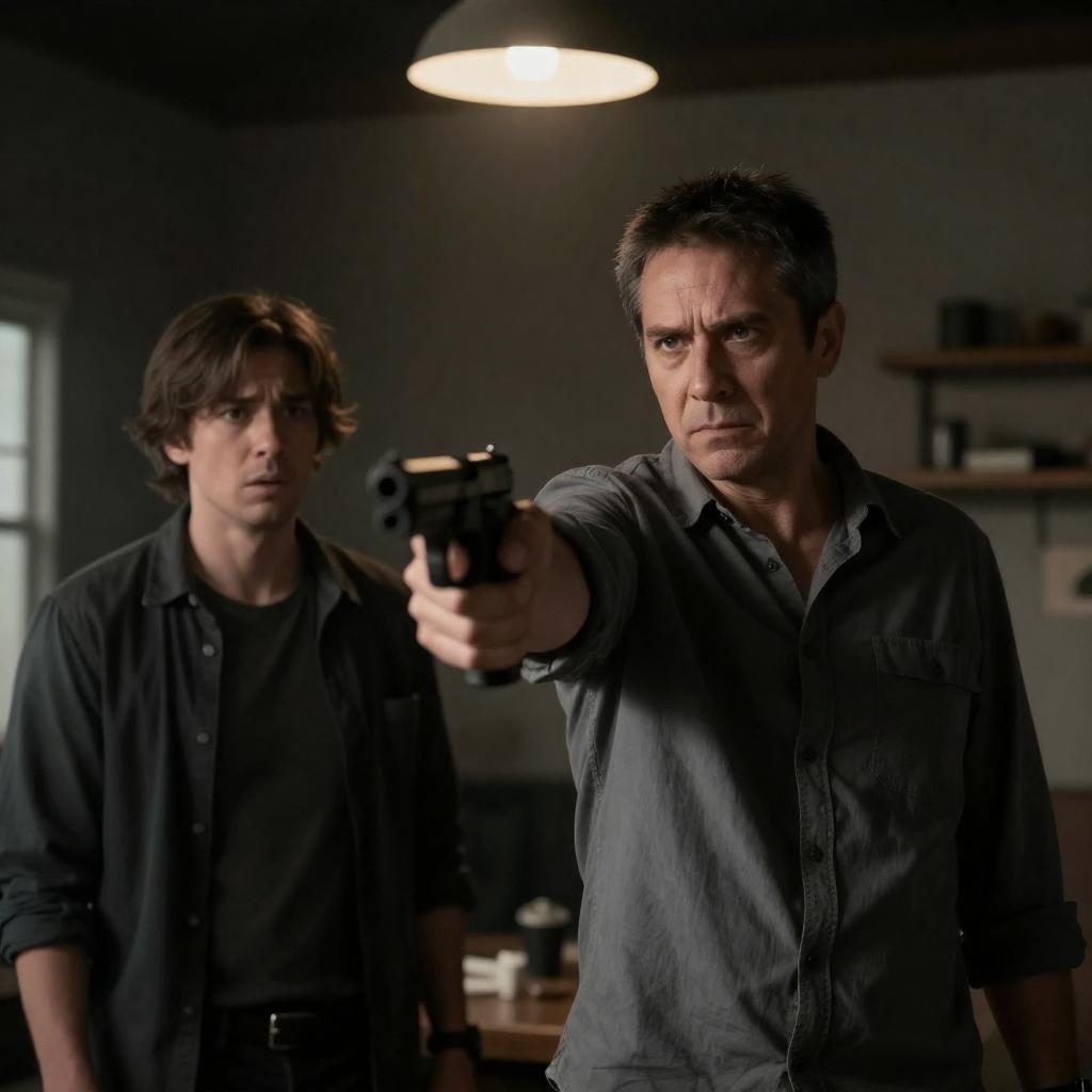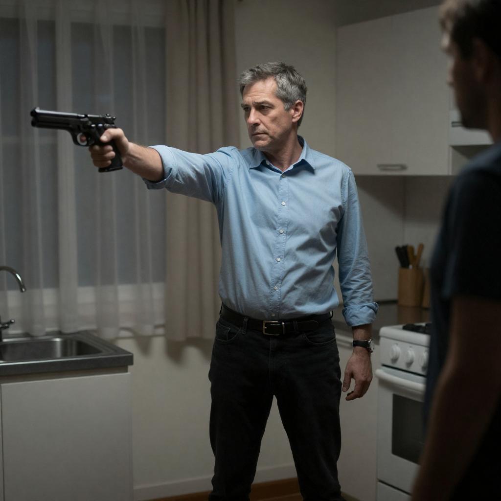 Photograph of a middle-aged man with short, graying hair, wearing a light blue button-up shirt and dark pants, standing in a kitchen with beige curtains and a window. A person in the foreground, partially visible, points a gun at him. The kitchen has a sink and stove, with a dim, tense atmosphere.