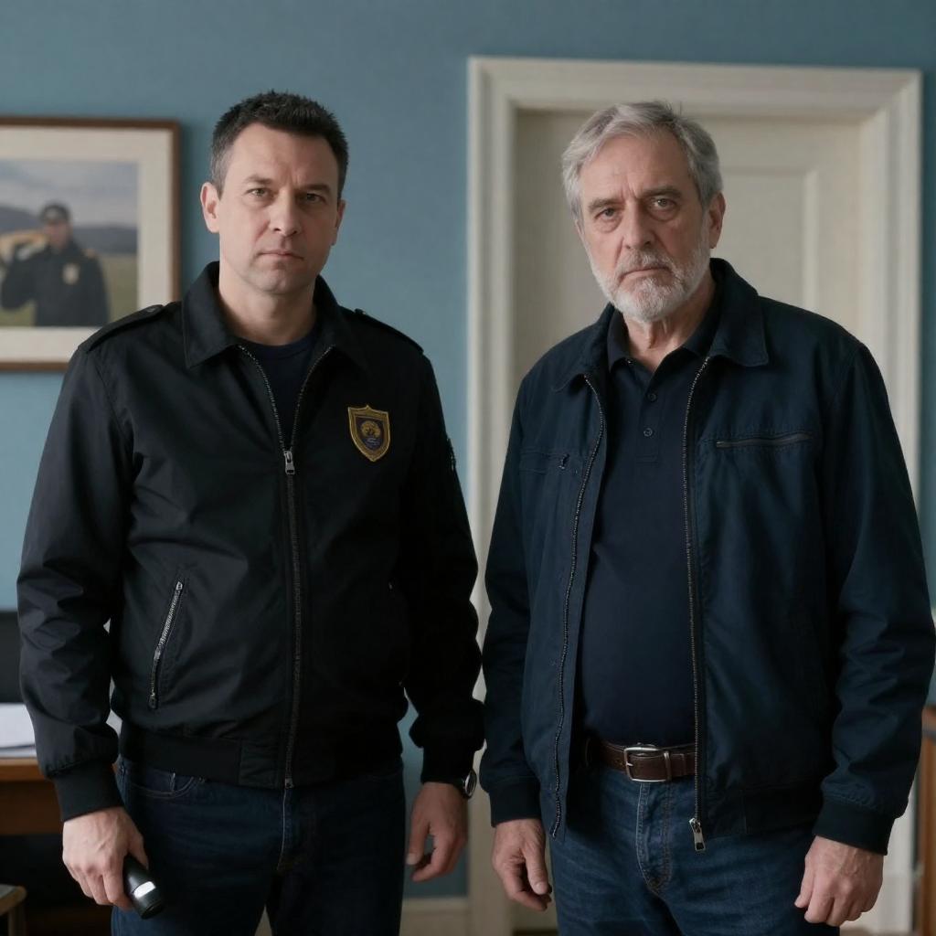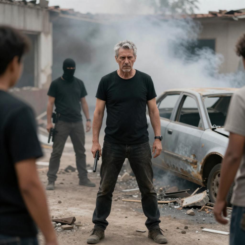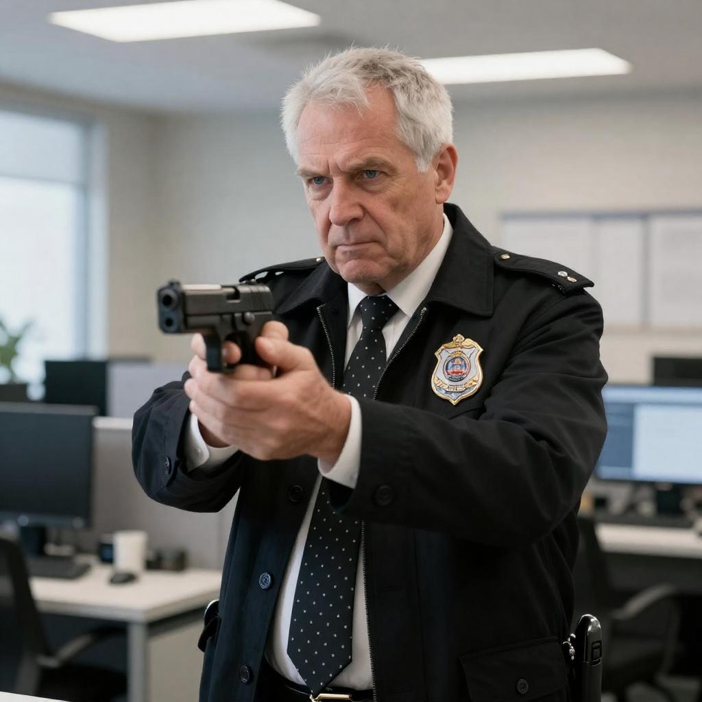Photograph of a middle-aged man with short, graying hair, wearing a light blue button-up shirt and dark pants, standing in a kitchen with beige curtains and a window. A person in the foreground, partially visible, points a gun at him. The kitchen has a sink and stove, with a dim, tense atmosphere.