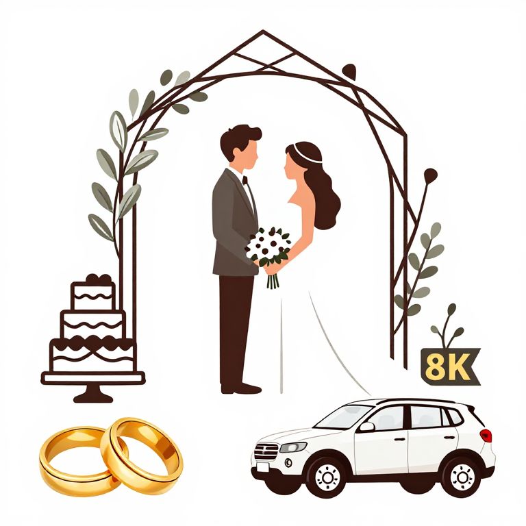 Minimalist digital illustration of a bride and groom kissing under a simple arch, with rings, cake, and a car in foreground.