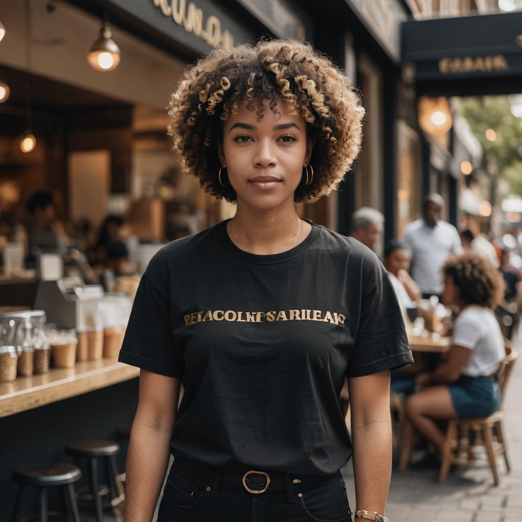 Portrait of a young African American woman with short curly afro hair featuring golden highlights. She wears a fitted black t-shirt with a subtle printed design, black belt, and hoop earrings. The background shows a bustling coffee shop with outdoor seating and patrons, captured in natural daylight with a shallow depth of field.