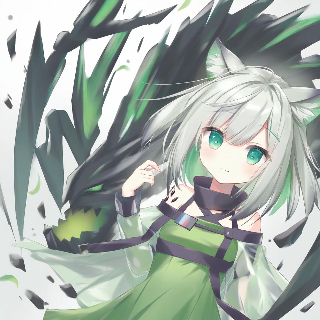 Mon3tr (arknights), arknights, 1girl, cat girl, monster, cat ears, animal ear fluff, green eyes, short hair, green hair, grey hair, white hair, green dress, bare shoulders, long sleeves, oripathy lesion (arknights), by artist ameto yuki, leet