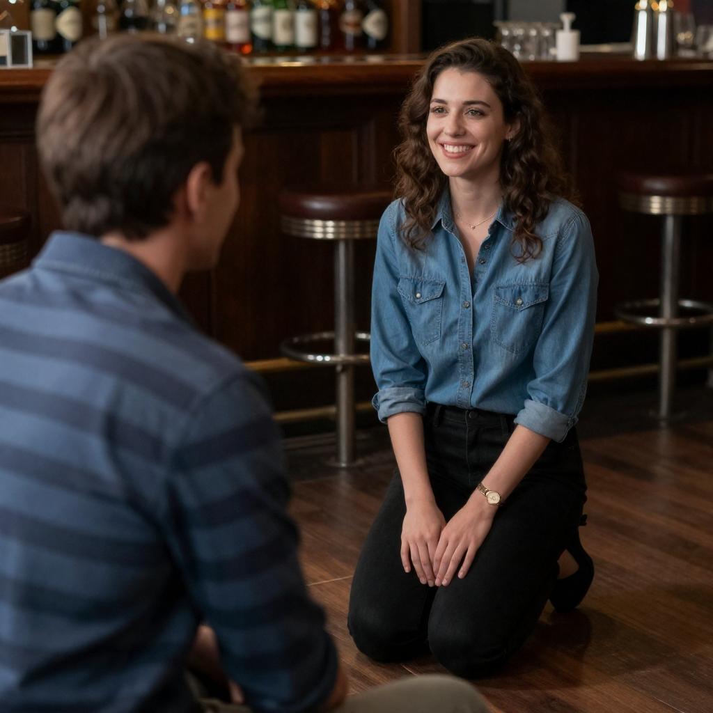 Photograph of a dimly lit bar. A woman with wavy brown hair, wearing a blue denim shirt and black pants, kneels on the wooden floor, smiling at a man with short brown hair in a blue and black striped shirt. The background includes bar stools and shelves with bottles. The man's back is to the camera.