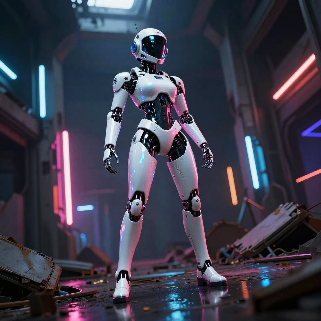 CGI image of a white, humanoid robot with black accents standing in a neon-lit, futuristic, damaged warehouse with colorful lights.