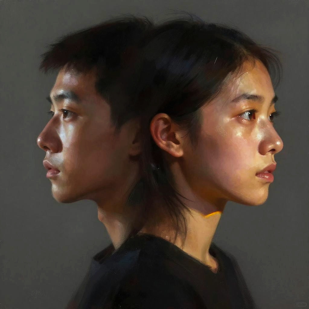 Clever profile pictures showing a creative fusion of face and light effects with dynamic shadows and highlights, cyberpunk influence, ultra-realistic digital painting