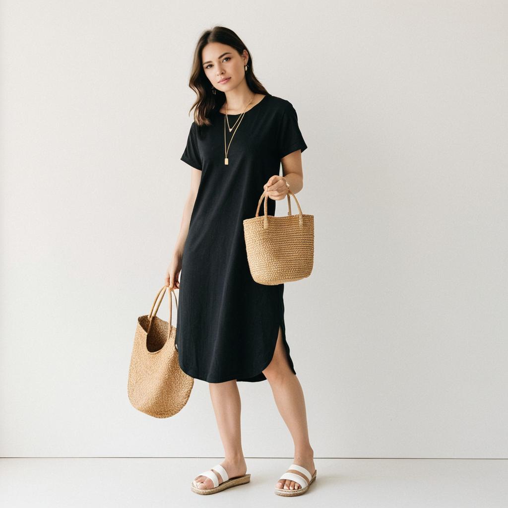 Woman, minimalist, black T-shirt dress with a relaxed fit, short sleeves, above-the-knee length with a curved hem, simple gold necklace, white sandals with ankle straps, holding a woven straw tote bag, plain white background.