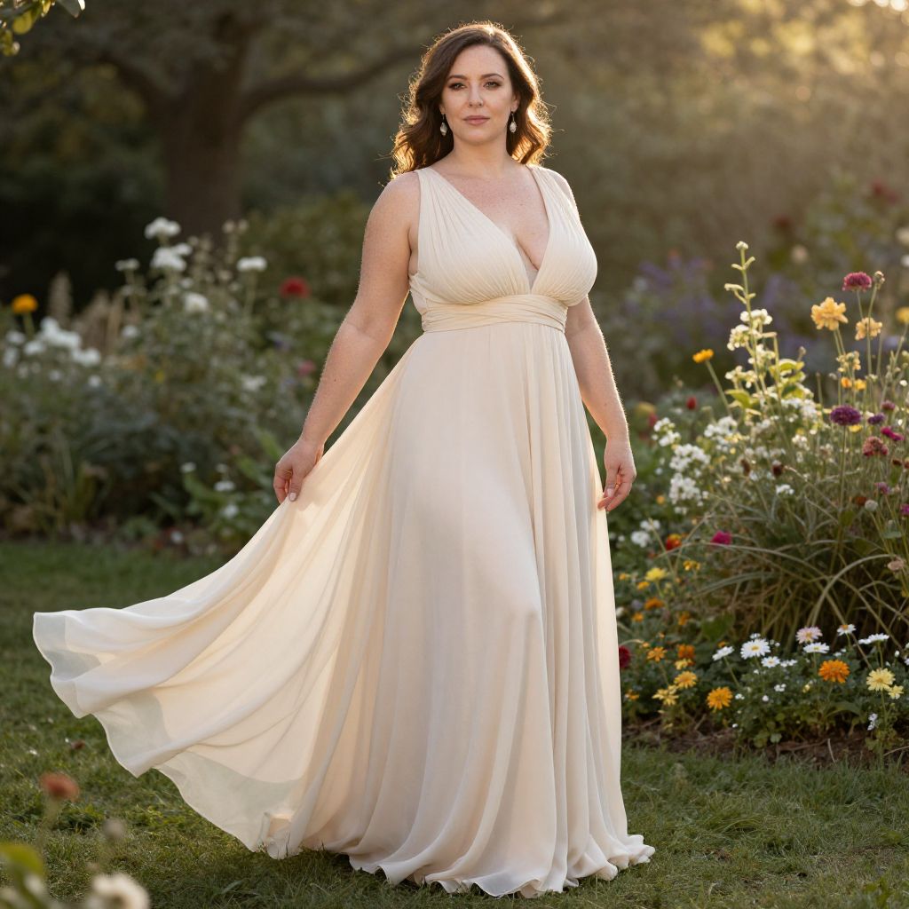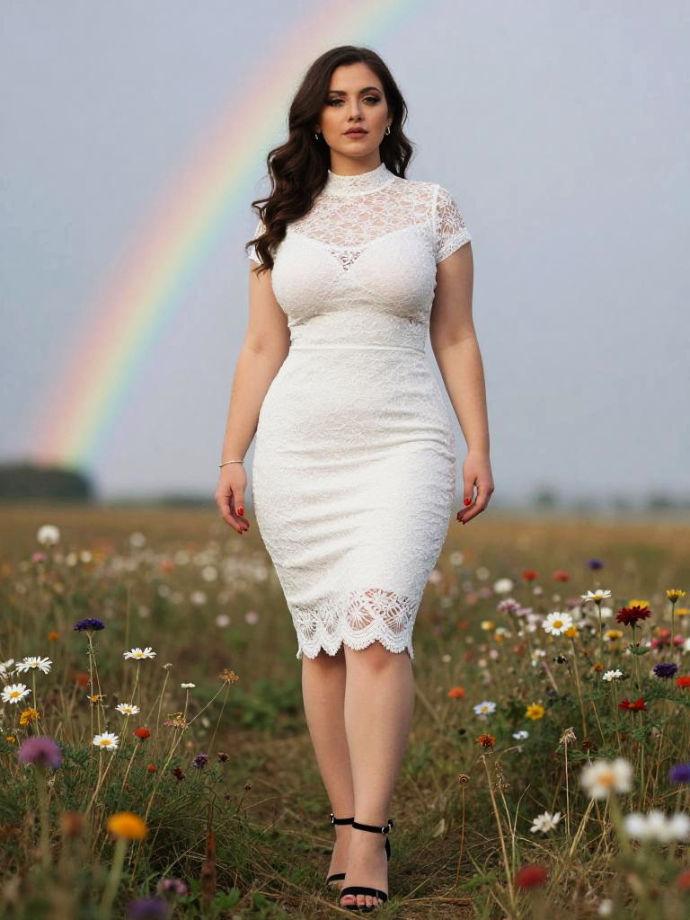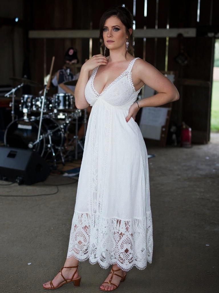A stocky woman in ethereal elegance, wearing a white maxi dress with delicate lace details and strappy brown leather sandals, stands gracefully at a rustic barn during a live music event, captured in the soft, dreamy style of a Holga camera. Sexy. Pretty face and beаutiful eyes. Big breasts