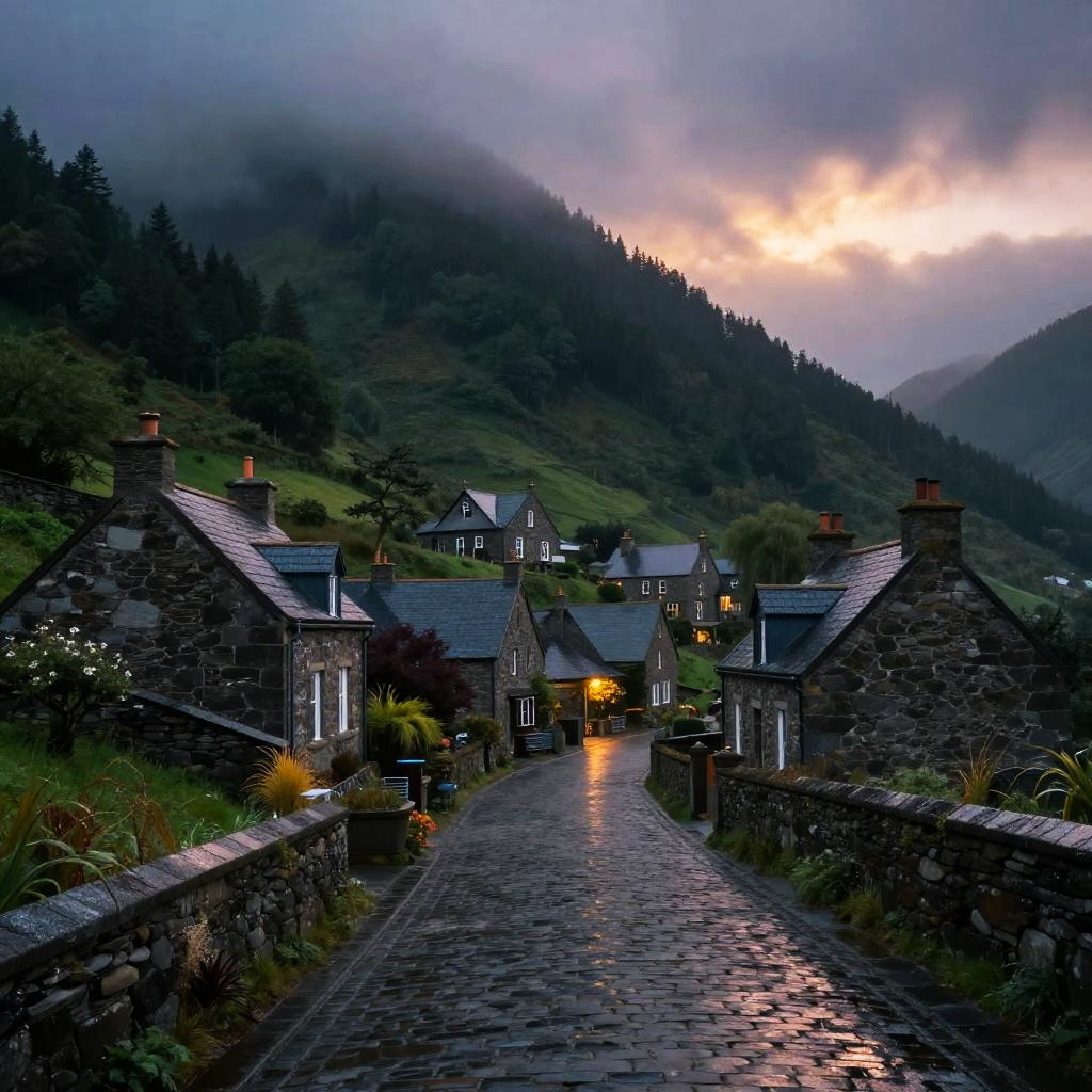 Elizondo, a mysterious small town nestled in lush green mountains, fog rolling over quaint stone houses, cobblestone streets glistening with recent rain, a twilight sky casting an eerie yet beautiful glow, cinematic and atmospheric style.