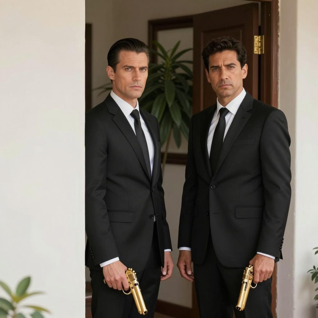 Two male police officers in dark uniforms and hats stand closely together in a dimly lit room. They hold handguns, with sparkling chandeliers and lampshades in the background. The officer on the left has short dark hair, while the officer on the right has a mustache. Both officers have serious expressions. The room is adorned with festive, silver tinsel.