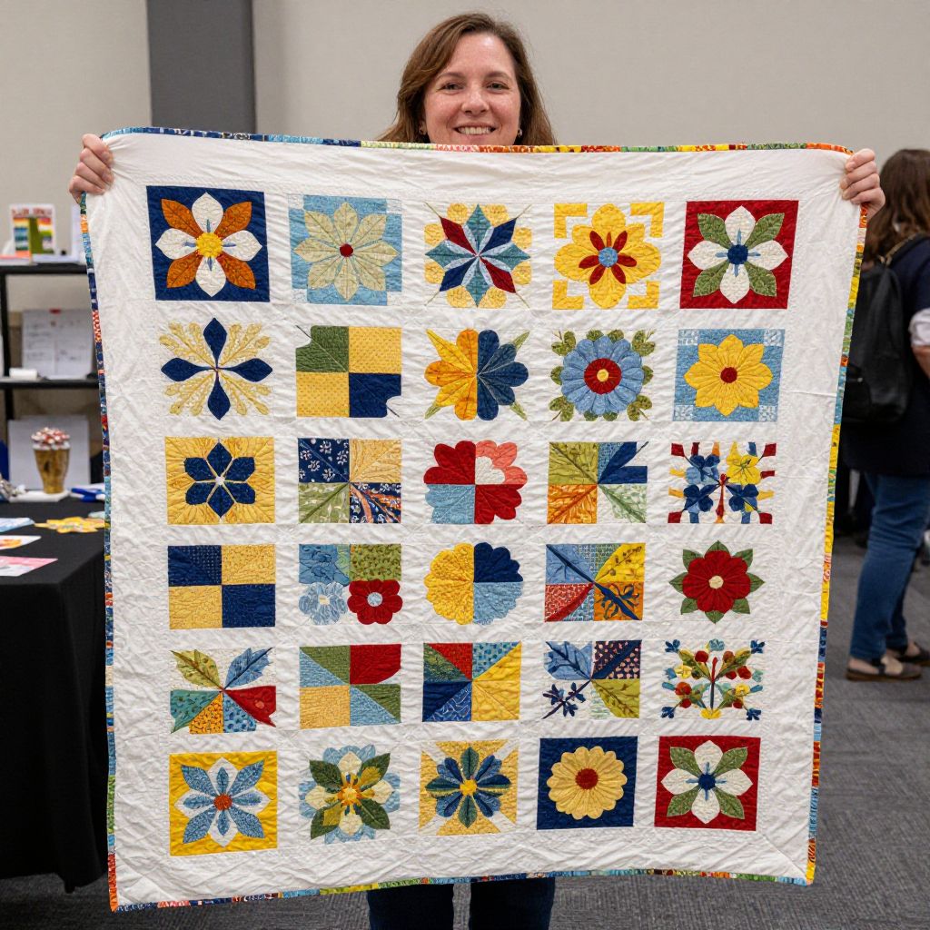 Woman proudly showcasing a vibrant quilt featuring 40 intricately designed floral patterns in a variety of colors, including blues, yellows, reds, and greens, at a quilt exhibition.