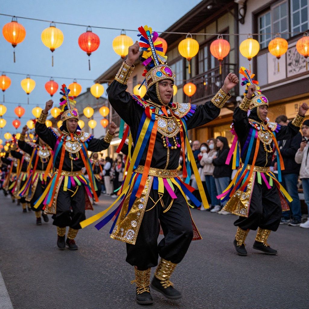Mashu dancer cosplay portrayed in a lively street parade, elaborately decorated with ribbons and sparkle accents, dancers moving rhythmically under colorful lanterns during twilight, capturing festive spirit and cultural richness.