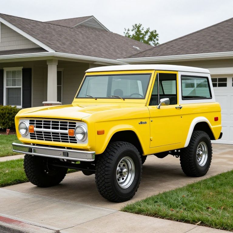 Vibrant yellow 1970 Ford Bronco parked gracefully in front of a suburban home, showcasing its classic design and pristine condition against a backdrop of manicured lawns and neighboring houses.