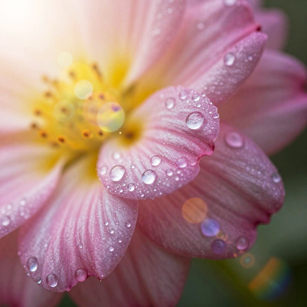 Add photorealism with lens FX online: a detailed macro shot of a flower covered in morning dew, glistening droplets catching light with beautiful lens flare, extreme close-up textures on petals, vivid natural colors with soft background bokeh.