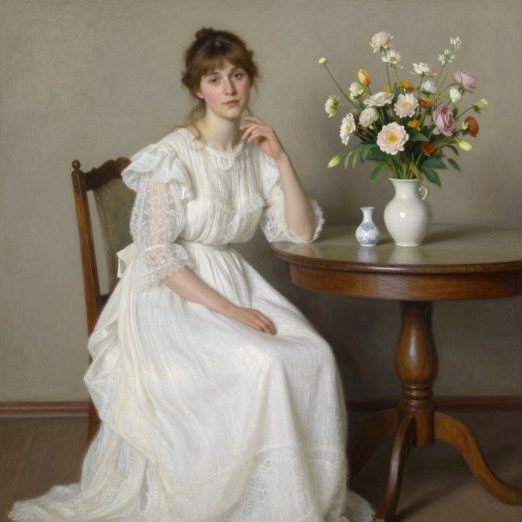 A serene digital rendering inspired by Zinaida Serebryakova's style, featuring a woman in a vintage white dress seated gracefully beside a wooden table adorned with a delicate floral arrangement and a small ceramic vase, bathed in soft, natural light that enhances the timeless elegance of the scene.