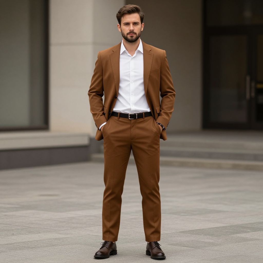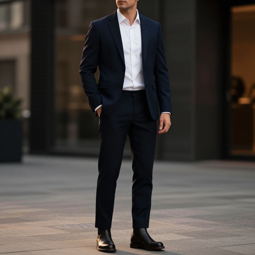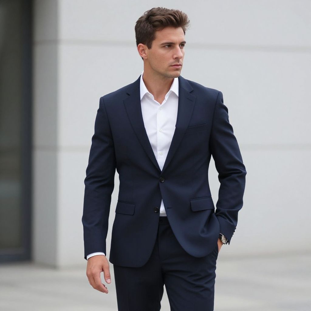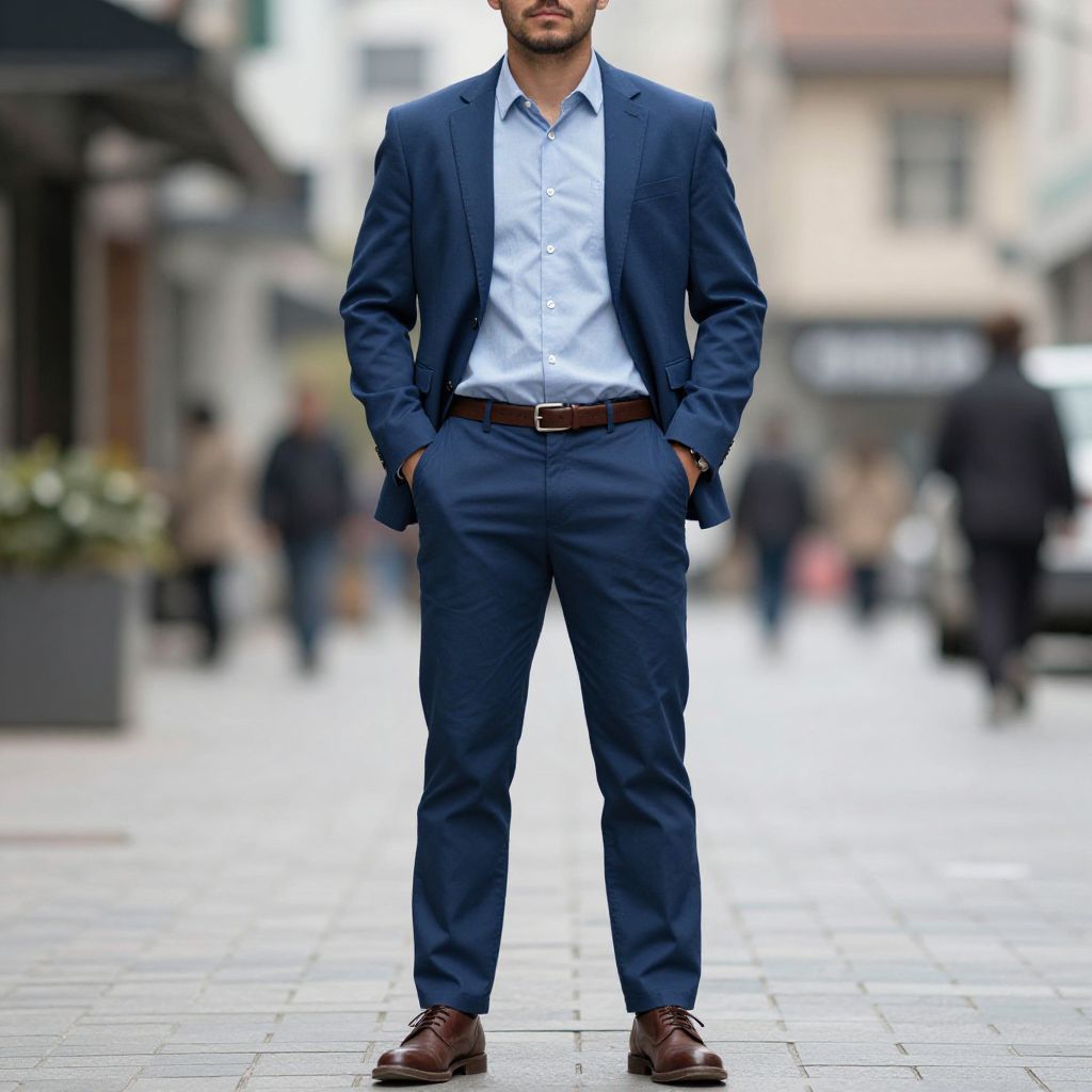 A fashion-forward joggers ensemble on a European man, styled with a tailored blazer and crisp white shirt, capturing a modern urban aesthetic in a high-fashion photo shoot.