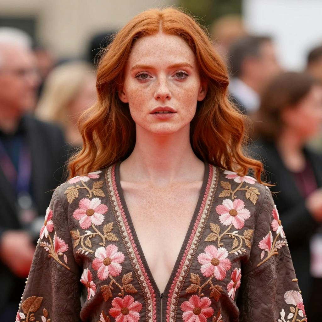 Close-up photograph of a woman with fair skin, red hair, and bangs. She has green eyes, red lipstick, and a wide, smiling mouth showing white teeth. She wears a black top. Background is blurred and dark.