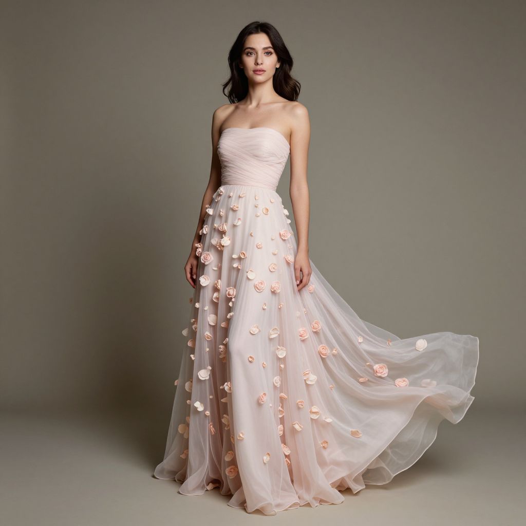 Elegant woman in a strapless, whitish-pink layered dress stands gracefully against a neutral backdrop, her flowing ruffled skirt resembling delicate rose petals.