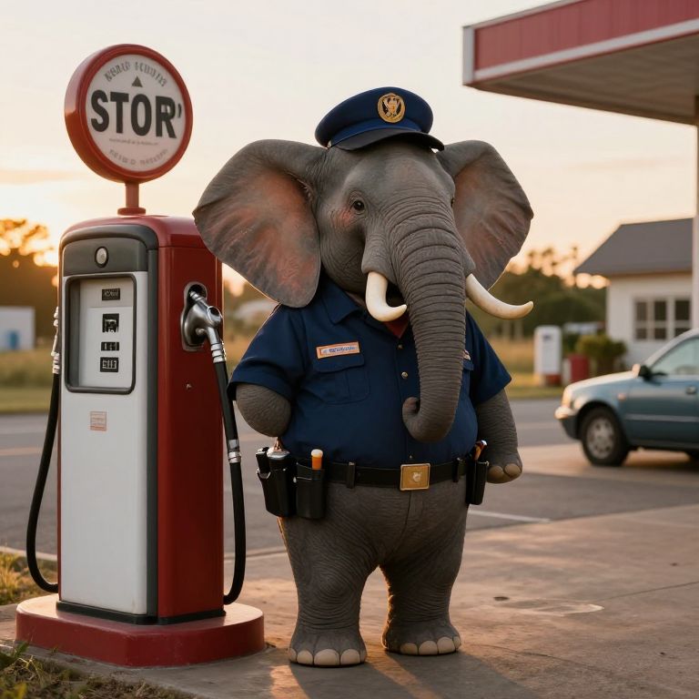 The image features an anthropomorphic elephant dressed as a gas station attendant, The elephant wears a uniform with a name patch, a matching cap, and a utility belt with tools, One of its tusks is decorated with a small charm, adding personality, It stands beside a vintage gas pump, holding a nozzle in its trunk, with a classic service station sign in the background, The setting is a rural roadside, with a warm sunset casting a golden glow over the scene, A car waits nearby, adding context to the interaction, Photo realistiic