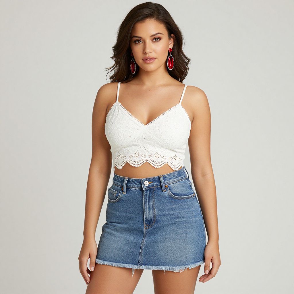 "Woman, casual summer style, white cropped lace camisole with thin straps, high-waisted denim mini skirt with frayed hem, red statement earrings with gemstone detail, clean simple studio background.. Sexy. Pretty face and beаutiful eyes. Big breasts."