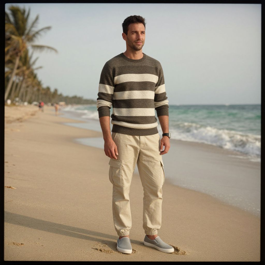 A man, striped crewneck sweater, beige cargo track pants, minimalist slip-on sneakers, tailored bomber, earthy tones, sandy beach, turquoise waves, palm trees swaying, calotype process, relaxed pose, soft smile, gazing at the horizon.Man has masculine face and piercing eyes