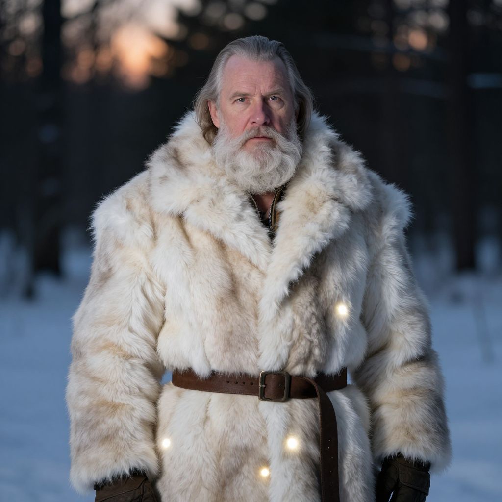 Photograph of an older white man with a long white beard, standing in a snowy forest at dusk. He's wearing a thick, luxurious white fur coat with a brown belt and glowing white lights embedded in the coat. His hair is slicked back, and he has a serious expression. The background shows dark, blurred trees with a soft orange glow in the distance.