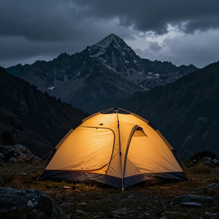 Amidst the brooding embrace of stormy peaks, a vibrant tent glows like a beacon of hope, casting warmth and solitude over the rugged wilderness, where the whispers of nature and the pulse of adventure intertwine.