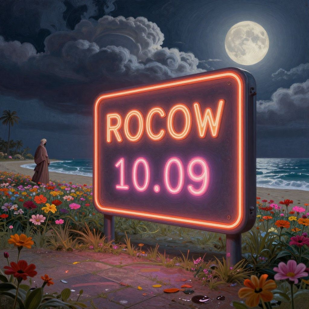 Photograph of a neon sign reading "ROCW 10.09" in bright red and pink lights, standing on a paved path surrounded by colorful flowers. The sign is illuminated against a dark, cloudy night sky with a full moon in the background. To the left, a lone figure in a brown robe stands near the beach, where waves gently crash. Palm trees and a distant shoreline are visible under the moonlit sky. The neon sign's glow contrasts with the dark, moody atmosphere, creating a vibrant focal point.