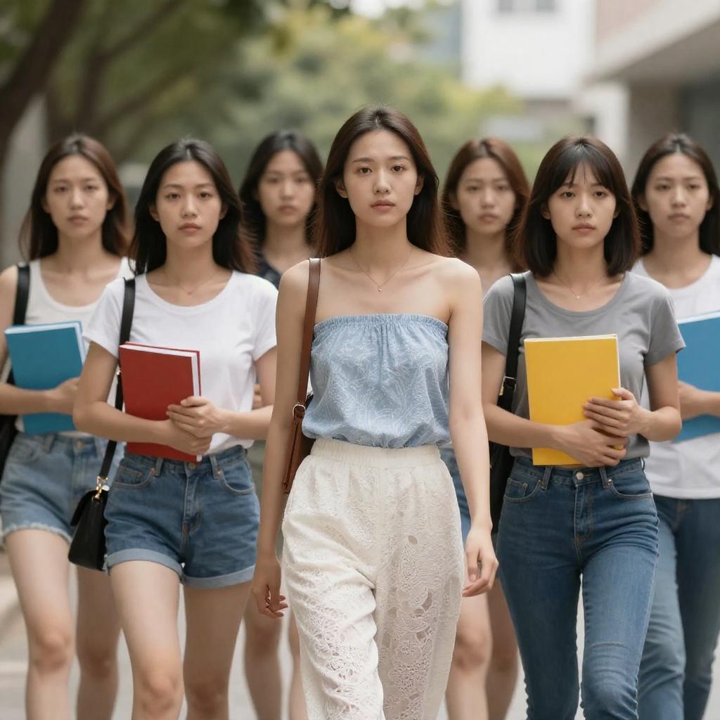 A group of young women dressed in light, airy clothing pose together against a backdrop of a picturesque coastal town. The serene setting and soft, natural light create a warm and inviting atmosphere.
