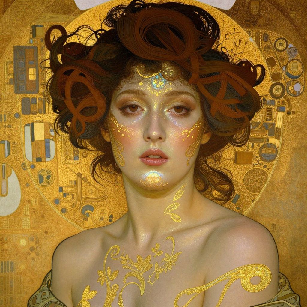 A woman with a glowing, iridescent face and intricate, golden patterns, reminiscent of Alphonse Mucha and Gustav Klimt's art.