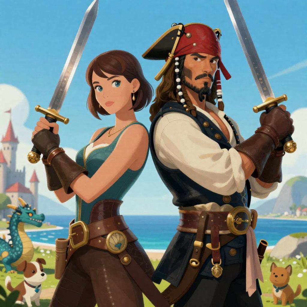 Digital illustration of a muscular man with brown hair and beard, wearing red pants with yellow trim and black boots, swinging from a rope. He has a determined expression and is mid-air above a ship's wheel. Background features blue sky, mountains, and ship rigging. He grips the rope with his right hand while his left hand holds a metal ring.