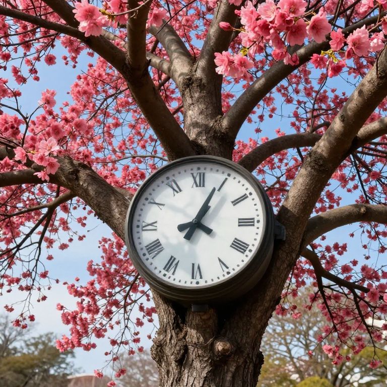 Photograph of a clock mounted on a tree trunk, surrounded by vibrant pink cherry blossoms. The clock has a black rim, white face, and black Roman numerals, with black hands pointing to 10:10. The tree's rough brown bark contrasts with the bright pink flowers and clear blue sky in the background. The branches spread out symmetrically, framing the clock centrally. The image captures a sunny, springtime scene, with the cherry blossoms in full bloom, creating a picturesque and peaceful atmosphere.