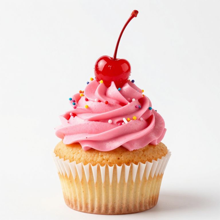 Delicious cupcake topped with vibrant pink frosting, colorful sprinkles, and a playful cherry, set against a clean white background.