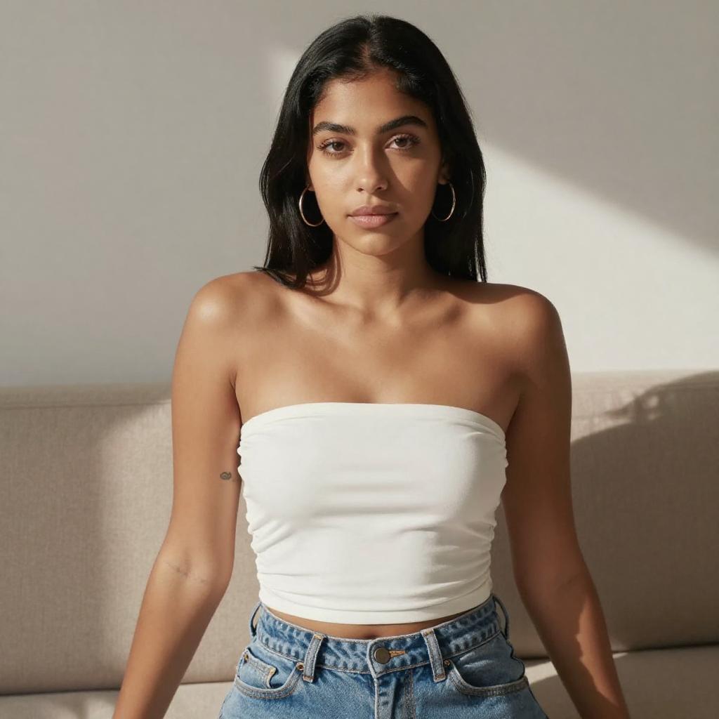 Photograph of a young woman with medium brown skin and dark hair in a messy bun, wearing a white, strapless, corset-style top and white drawstring pants. She stands against a gray wall, her right hand touching her chest and her left hand resting on her hip. She has a small belly button piercing and a tattoo on her left forearm.