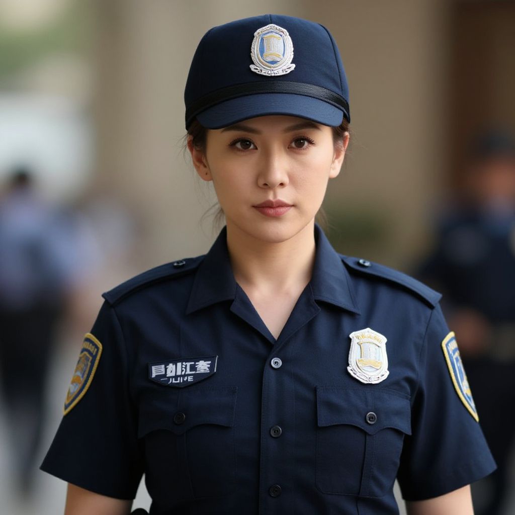 Adult woman cop costume, 1girl, solo, police, police uniform, uniform, policewoman, realistic, hat, brown hair, blurry background, blurry, lips, looking at viewer