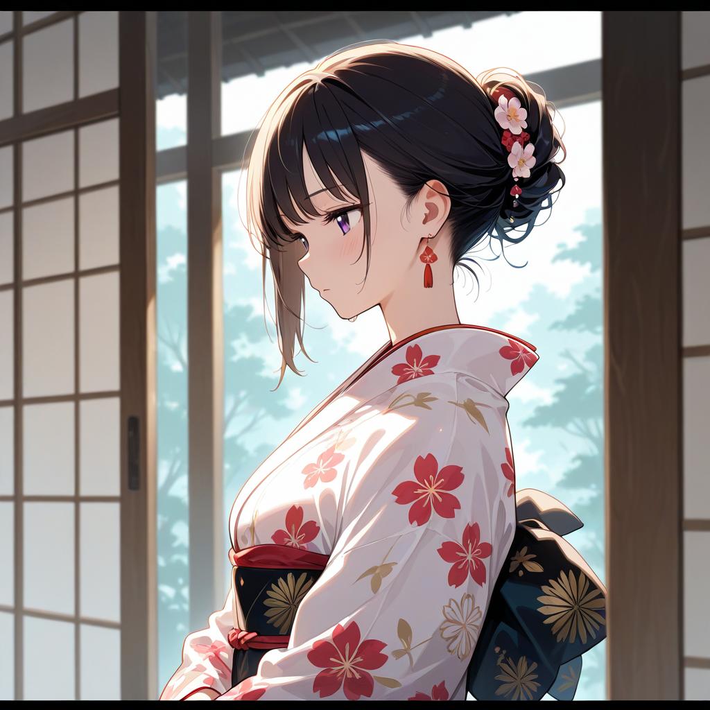 Score_9, best quality, masterpiece, uncensored, source_anime1girl, solo, looking at viewer, blush, smile, short hair, bangs, black hair, hair ornament, long sleeves, closed mouth, upper body, flower, outdoors, japanese clothes, day, looking back, hair flower, pink eyes, kimono, tree, sash, umbrella, one side up, obi, floral print, snow, snowing, railing, oil-paper umbrella, winter