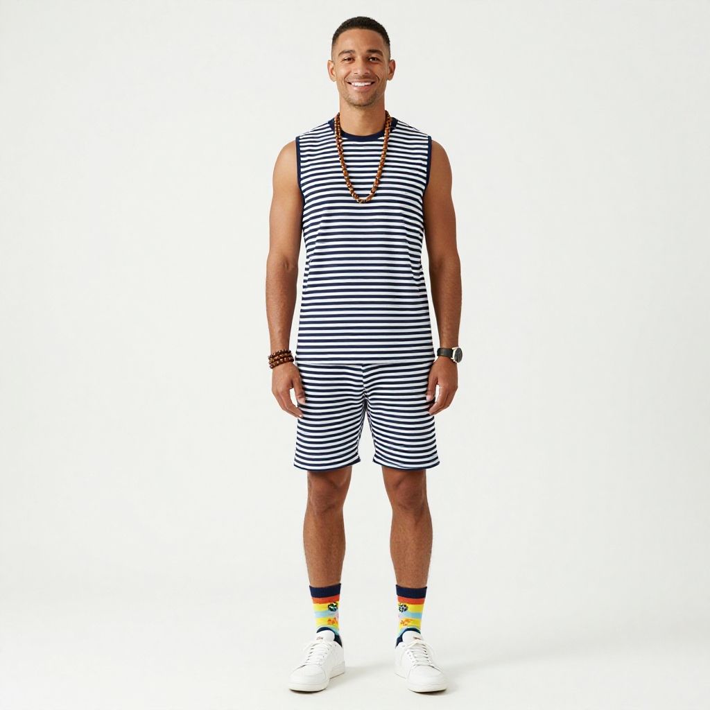 Smiling athletic man wearing a matching sleeveless striped shirt and shorts, paired with white sneakers and colorful ankle socks. Accessories include wooden necklaces, bracelets, and a wristwatch. The photo has a minimalist white background.