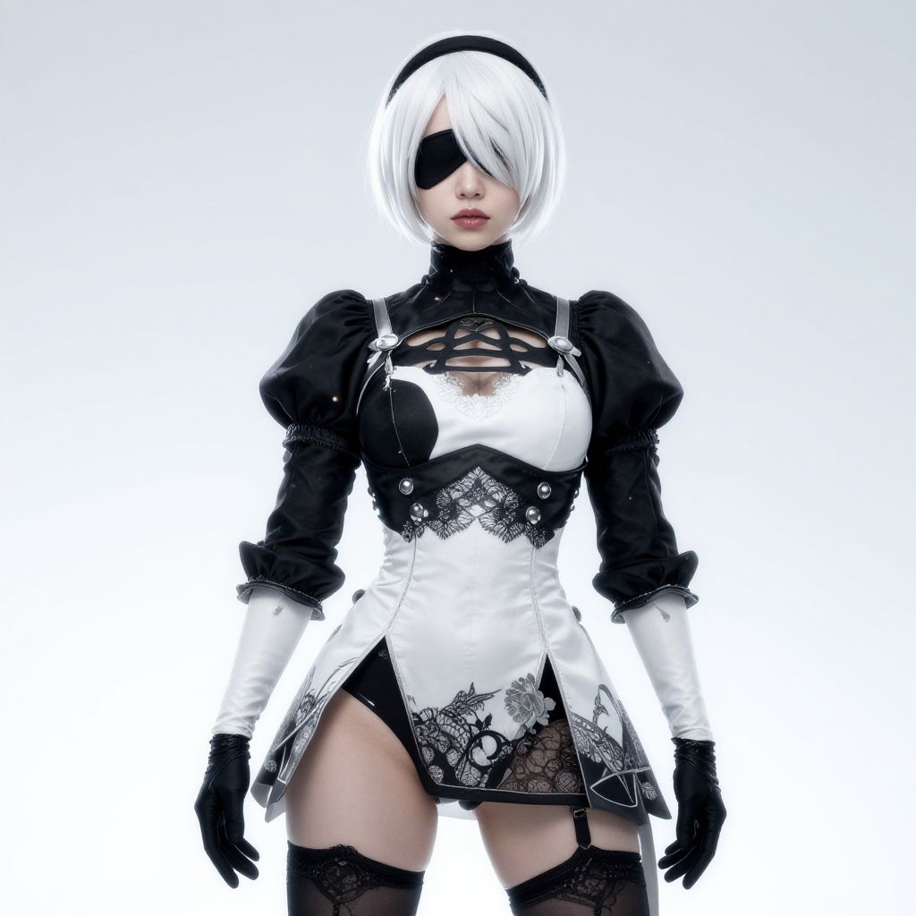 Photograph of a woman in detailed black and white cosplay, resembling 2B from Nier: Automata, with white bob hair, black eye