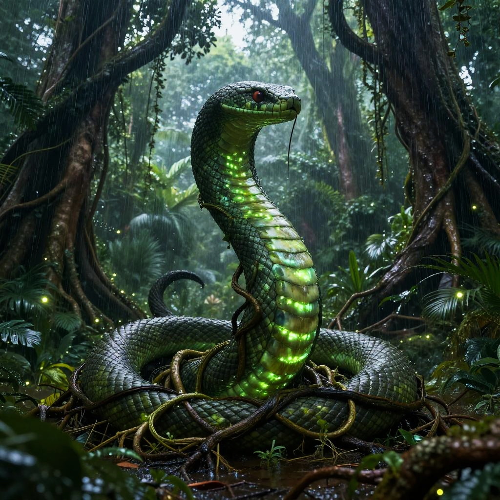 Jörmungandr – The world serpent, enemy of Thor, shown as a colossal serpent woven from roots and vines, its body pulsating with living green bioluminescence, set in a dense jungle soaked in heavy rain with towering ancient trees and flickering fireflies.