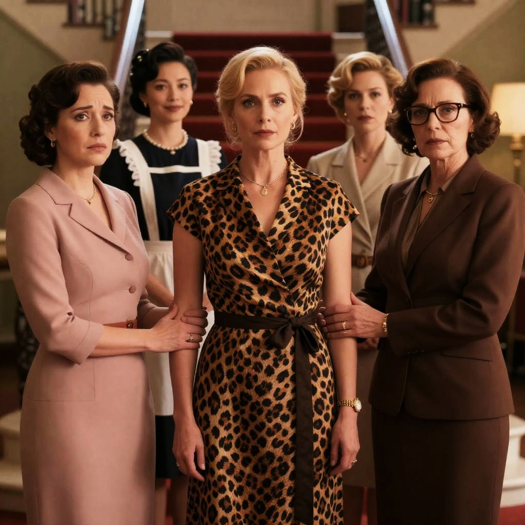 Photograph of four women in vintage 1940s attire with large hats. Central woman in orange dress holds yellow flowers, gestures with right hand. Woman on left wears purple hat and lavender dress, holds bouquet. Woman on right in orange dress, brown fur, gestures. Man in brown suit on right. Background: blurred people, warm lighting. Facial expressions: focused, neutral, slightly concerned.