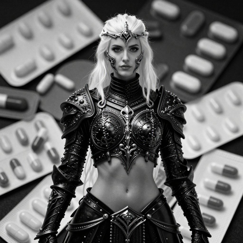 Digital art of a blue-haired woman in black, ornate armor, standing amidst various pill packages. She has a fierce expression and a crown, with
