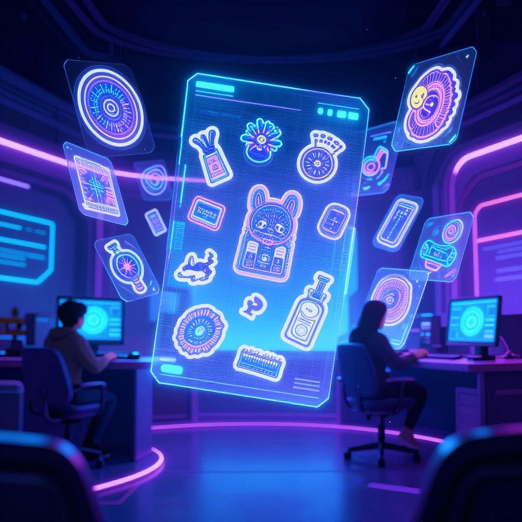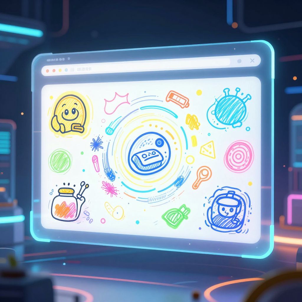 Doodle AI interface with colorful hand-drawn sketches coming to life on a transparent screen, surreal futuristic environment, glowing lights and tech elements, blending traditional doodle art with advanced AI technology