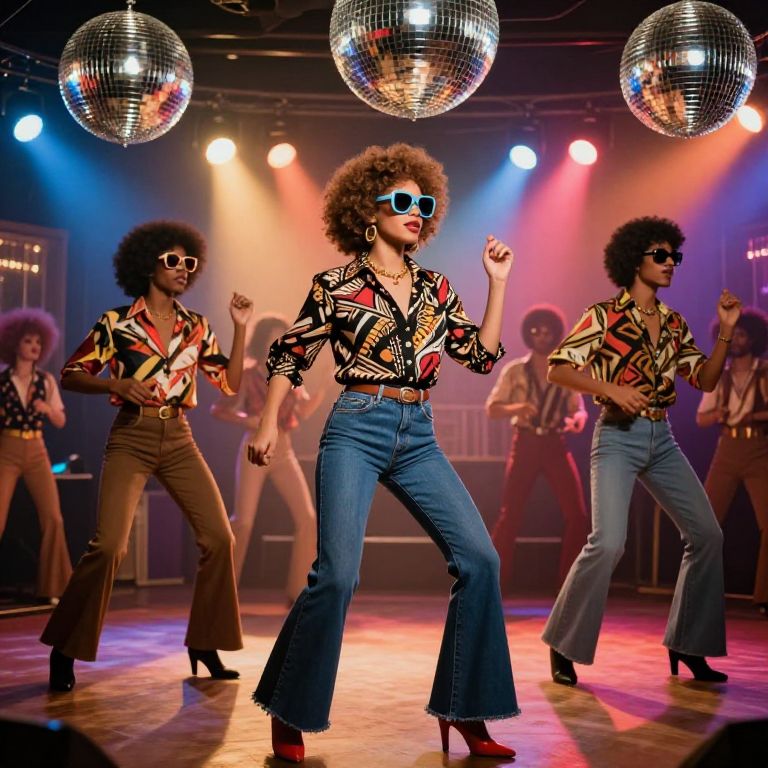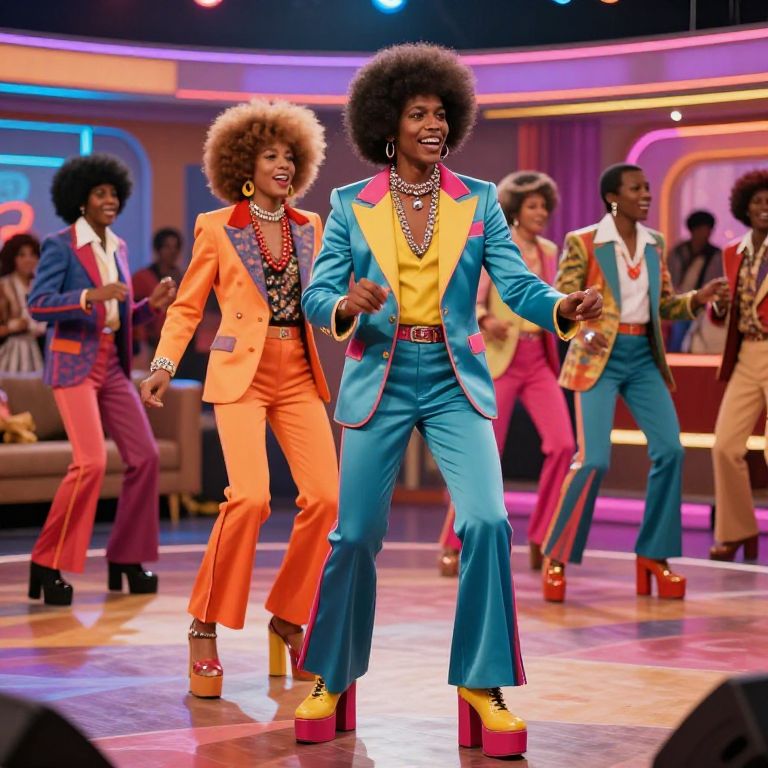 Disco Soul Train 70s black fashion featuring funky patterned shirts, bell-bottom jeans, oversized sunglasses, and bold accessories, with dancers showing off iconic moves under sparkling disco balls and colorful stage lights, evoking the soulful groove and style of classic 70s nightlife.