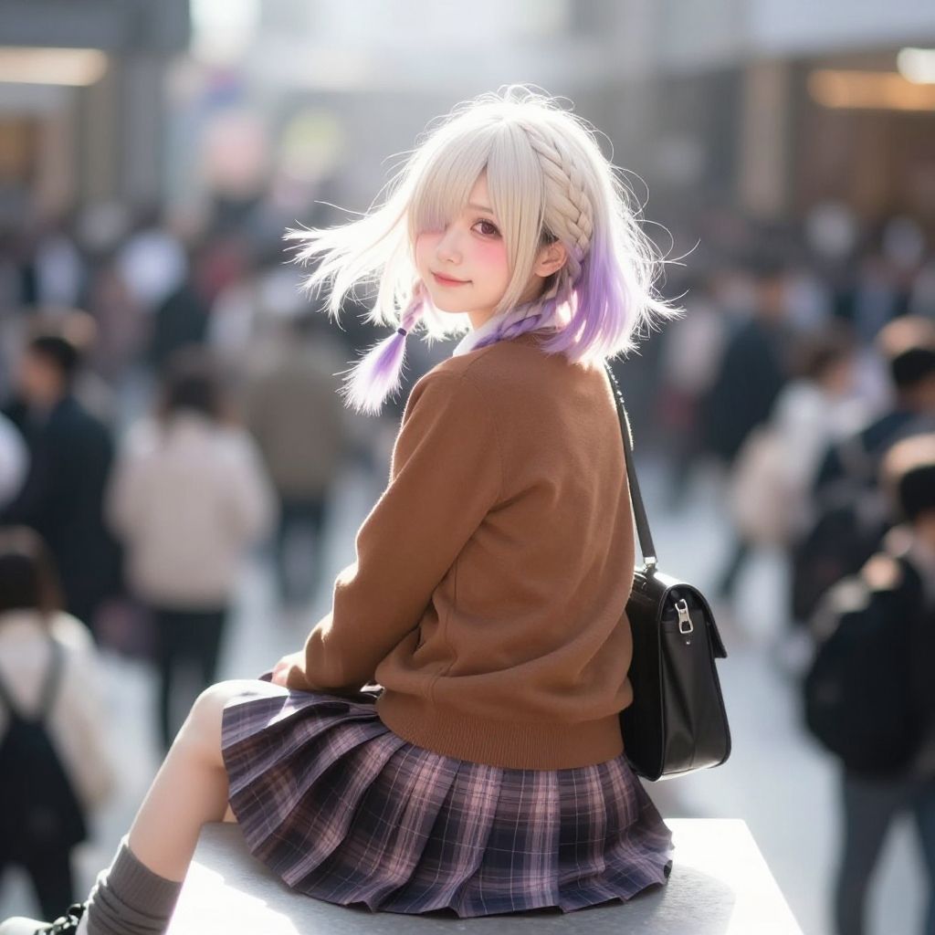 This digital anime-style drawing features a young girl with pale skin and white-blonde hair with purple-tinted tips. She is wearing a brown sweater, a plaid skirt in shades of purple and black, and knee-high socks. She has a black shoulder bag and is sitting on a bright, glowing surface in a blurred, busy urban setting. The light from the surface highlights her hair and face, giving her a radiant appearance. She looks over her shoulder with a slight smile. The background shows indistinct figures and buildings, creating a sense of depth and movement. The overall style is vibrant and dynamic.