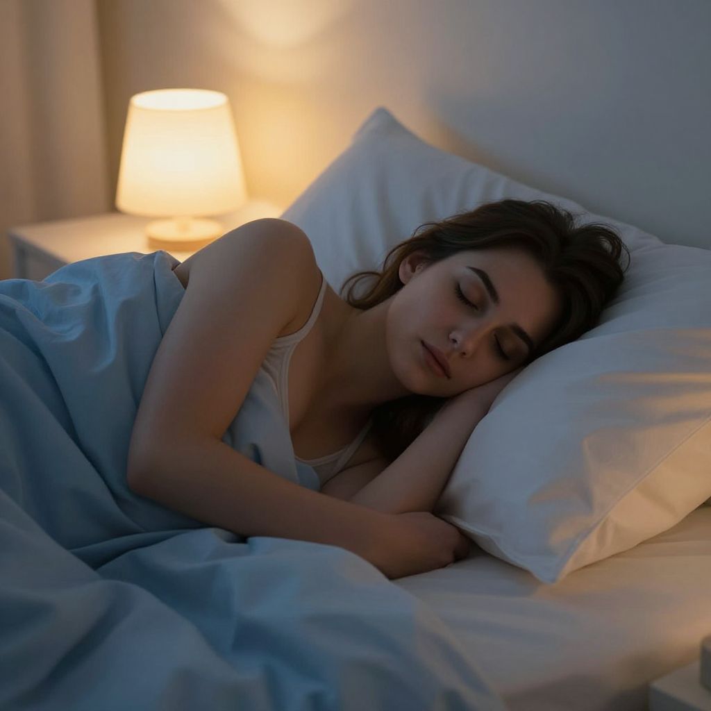 Serene woman sleeping peacefully under a soft blue blanket, nestled against crisp white pillows, illuminated by the warm glow of a bedside lamp casting gentle light in a dimly lit room.